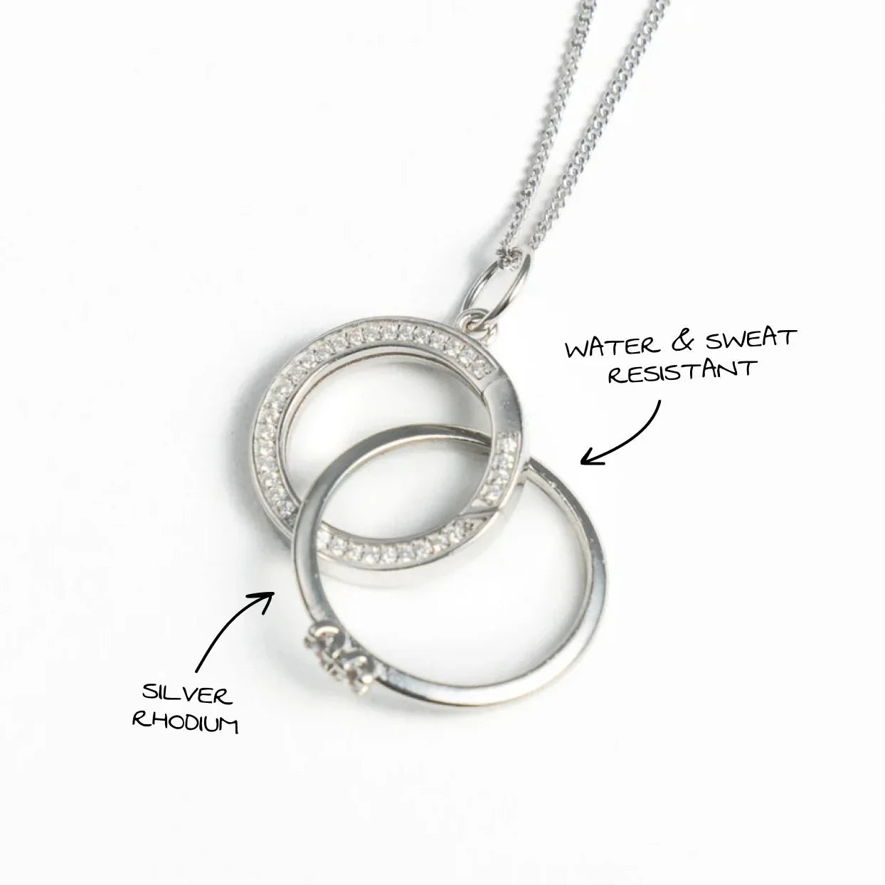 Keep your rings safe with this stunning 925 sterling silver chain and Bound "Circular Embrace" Pendant plated with a premium Rhodium coating or 18k Gold for everyday wear.